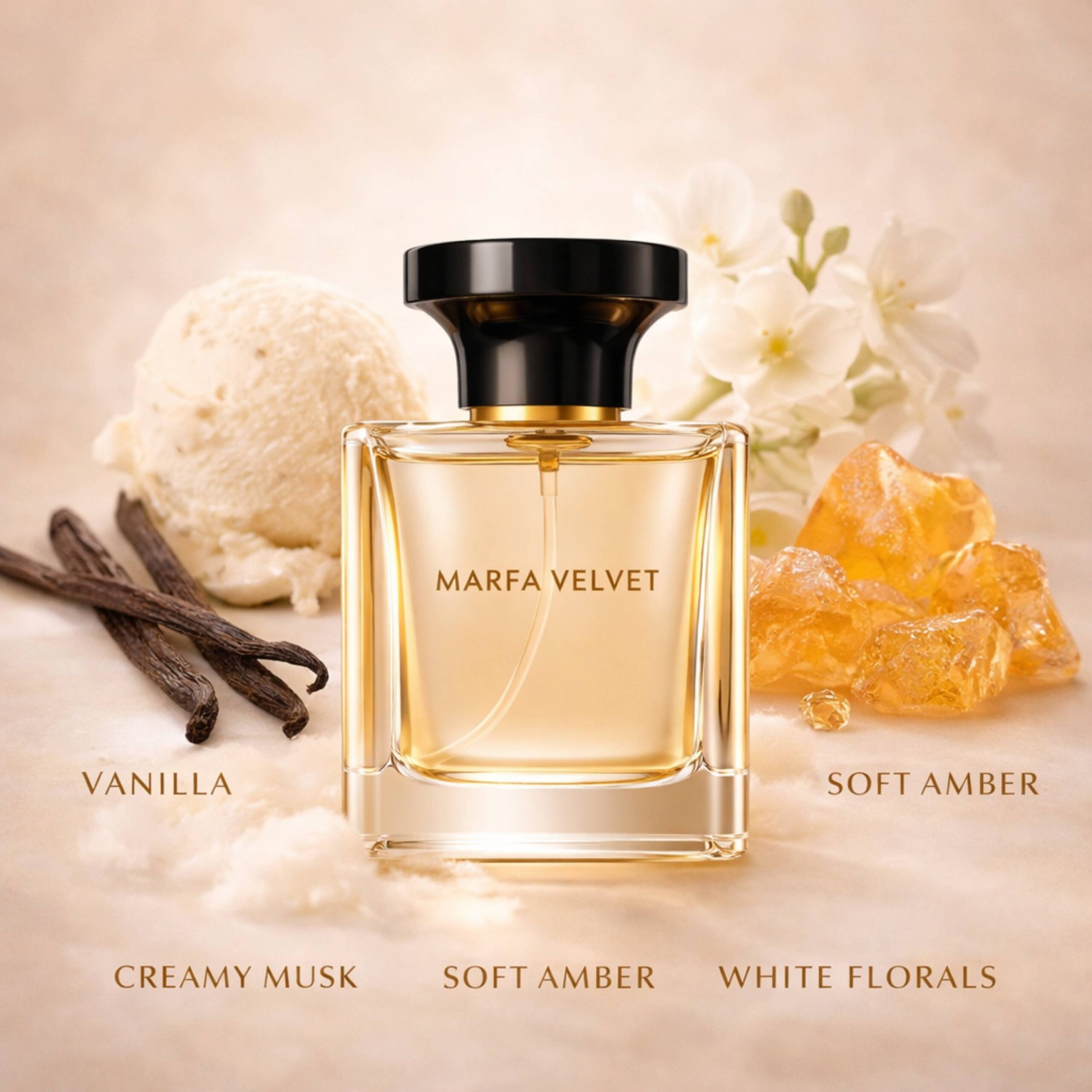Marfa Velvet is a creamy vanilla luxury perfume that wraps you in softness. Built for anyone who wants to feel effortlessly elegant.